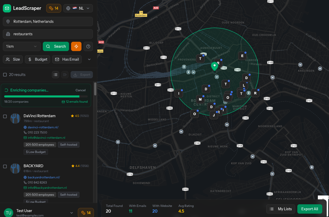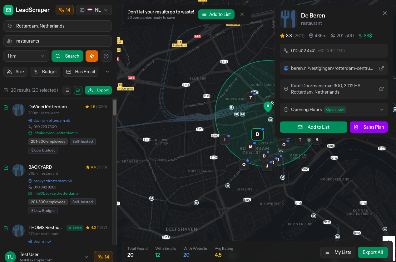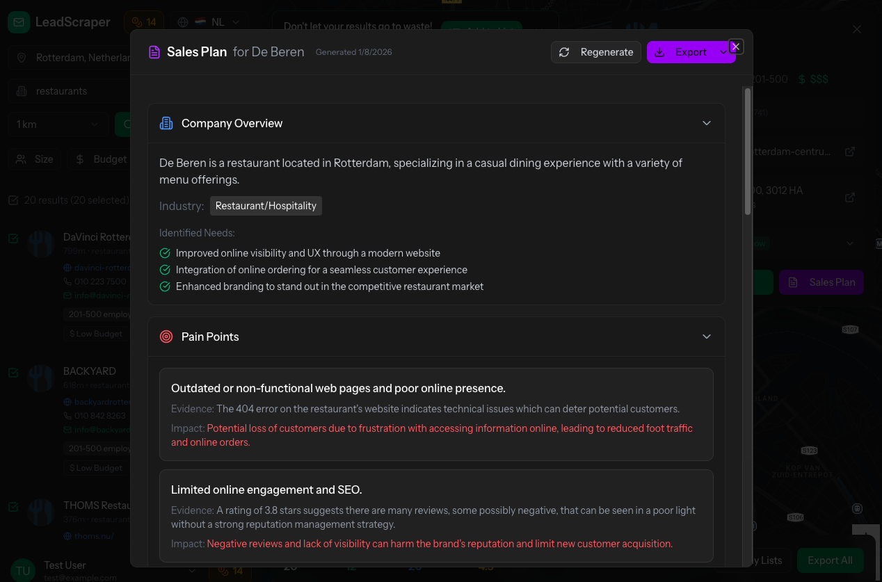 Een complete B2B lead generation tool die lokale bedrijven vindt, contactgegevens ontdekt, en AI-gestuurde sales strategieën genereert. Alles in één platform.
